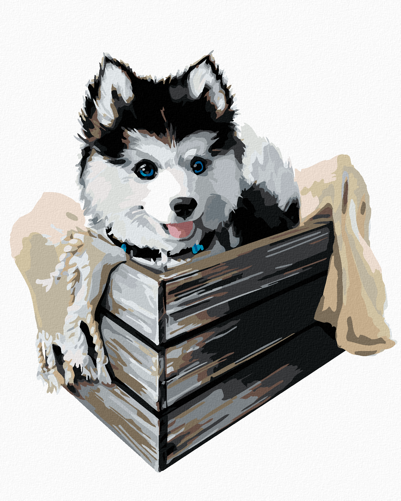 Malen nach Zahlen - HUSKY IN EINER KISTE