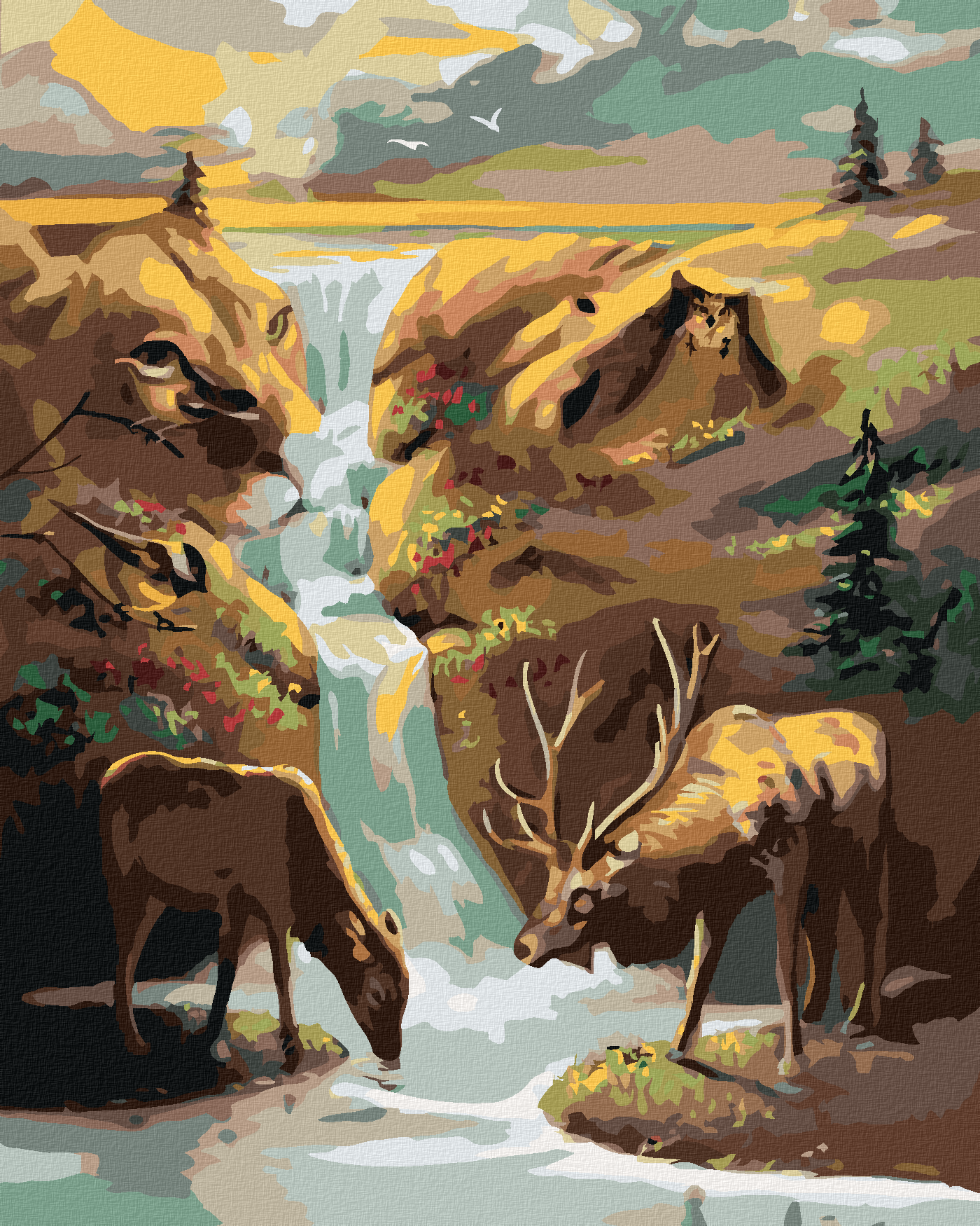 Malen nach Zahlen - HIRSCH, WASSERFALL UND SONNENUNTERGANG (D. RUSTY RUST)
