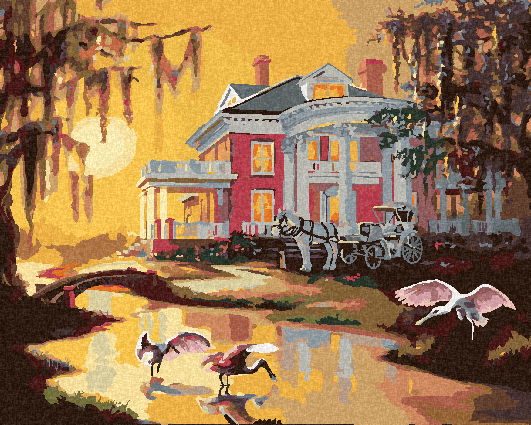 Malen nach Zahlen - KUTSCHE MIT WEISSEM PFERD AM HAUS, VÖGEL UND SONNENUNTERGANG (D. RUSTY RUST)