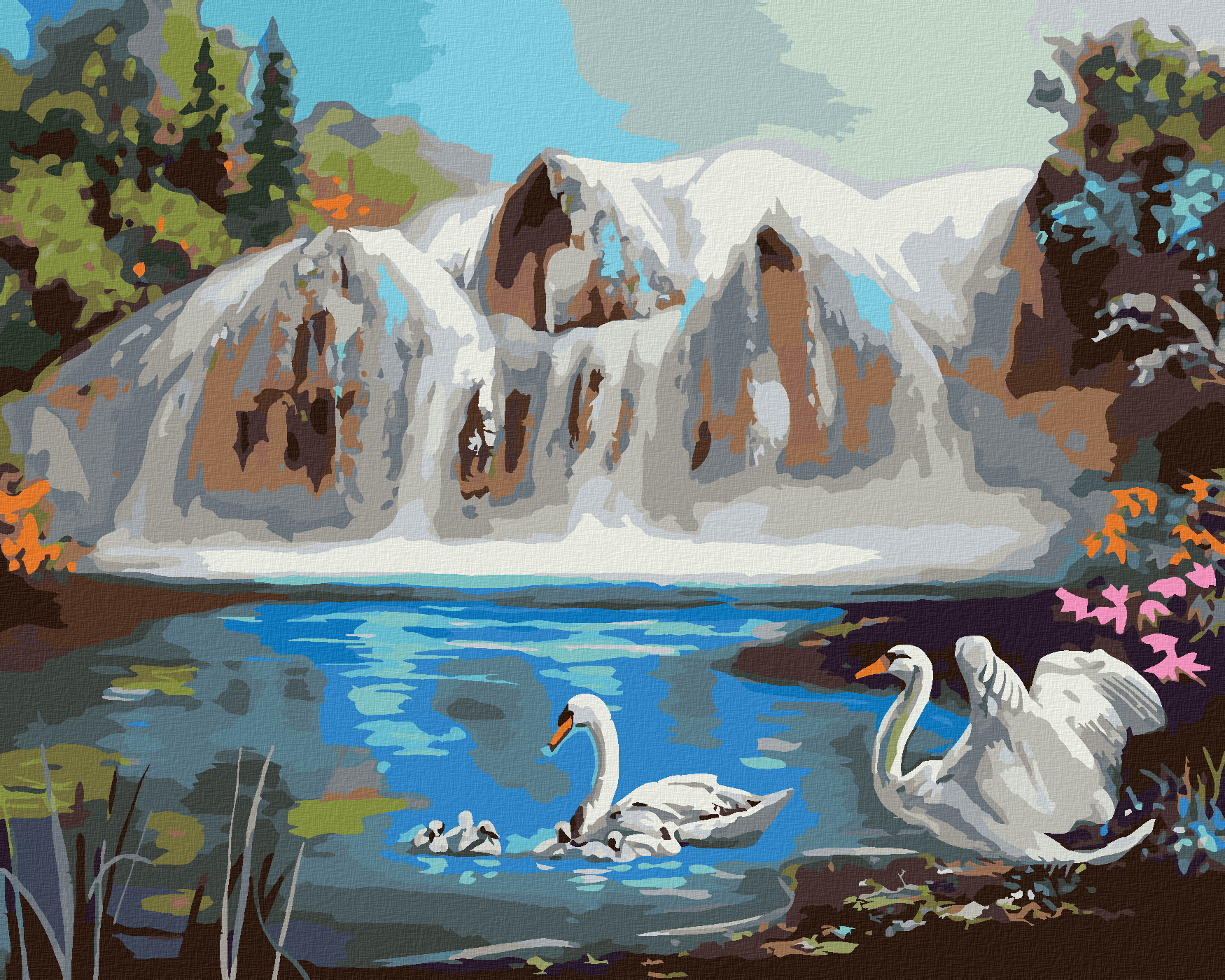Malen nach Zahlen - SCHWÄNE AUF EINEM SEE UND WASSERFALL (D. RUSTY RUST)