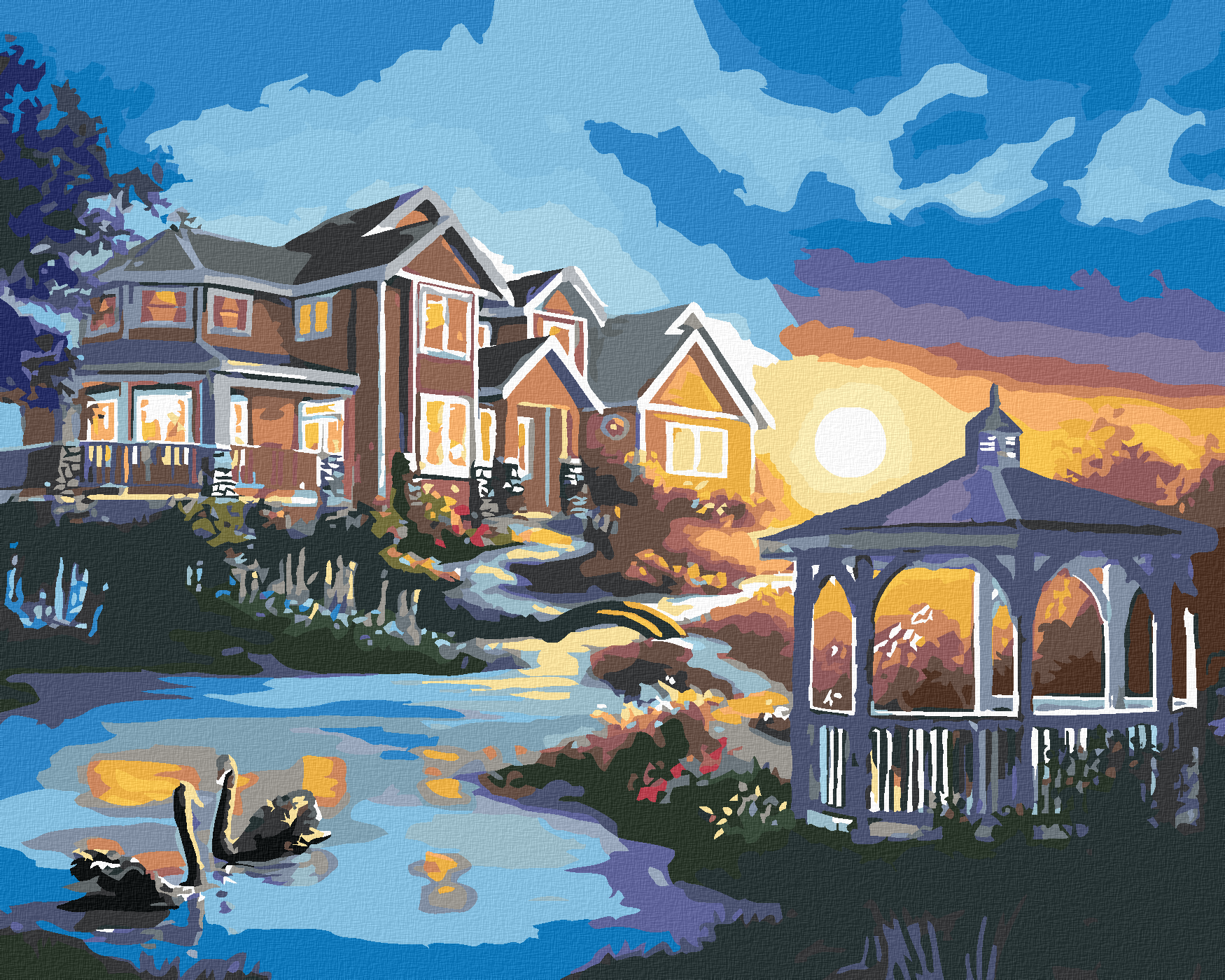Malen nach Zahlen - SCHWÄNE, PAVILLON AM HAUS UND SONNENUNTERGANG (D. RUSTY RUST)