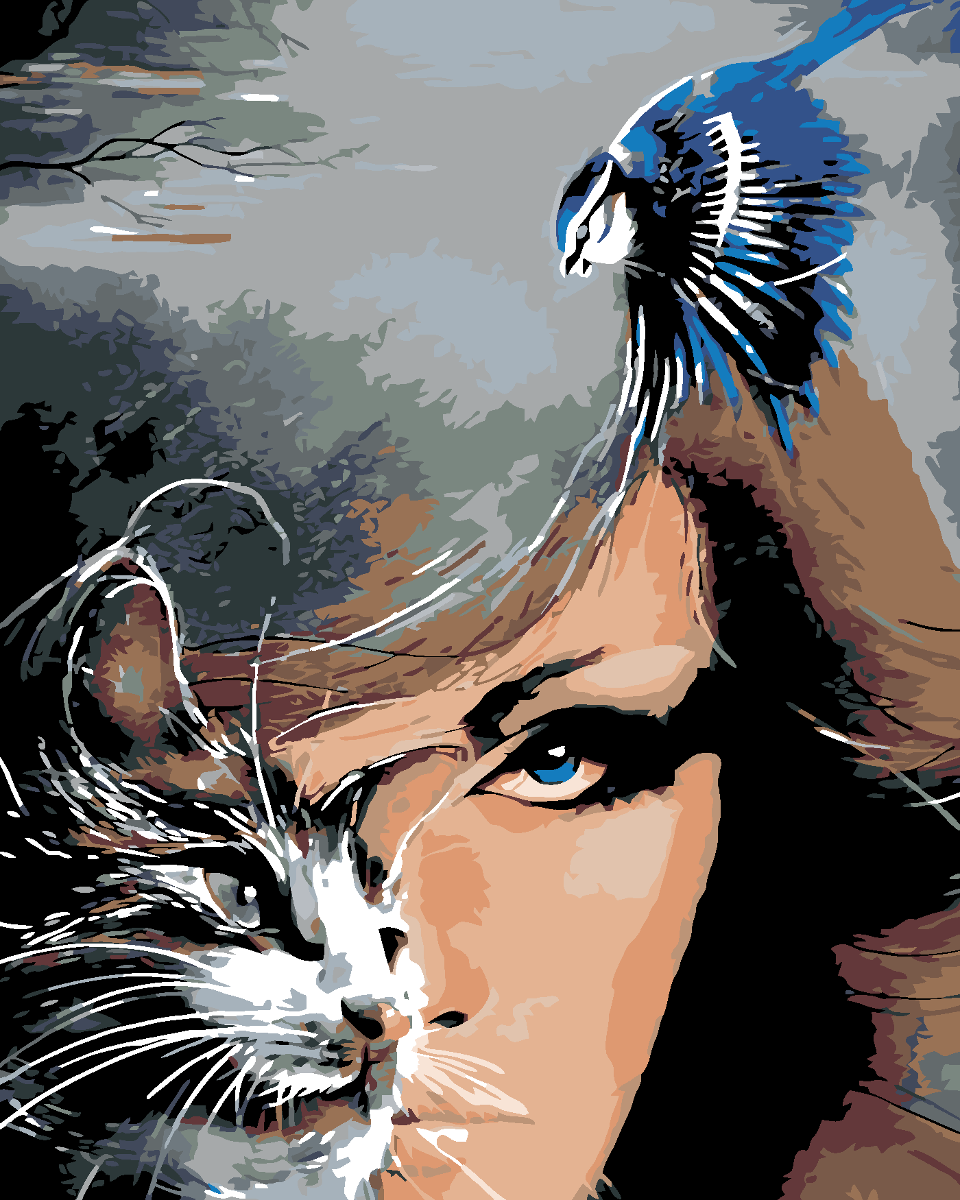 Malen nach Zahlen - FRAU KATZE UND BLAUES VÖGLEIN