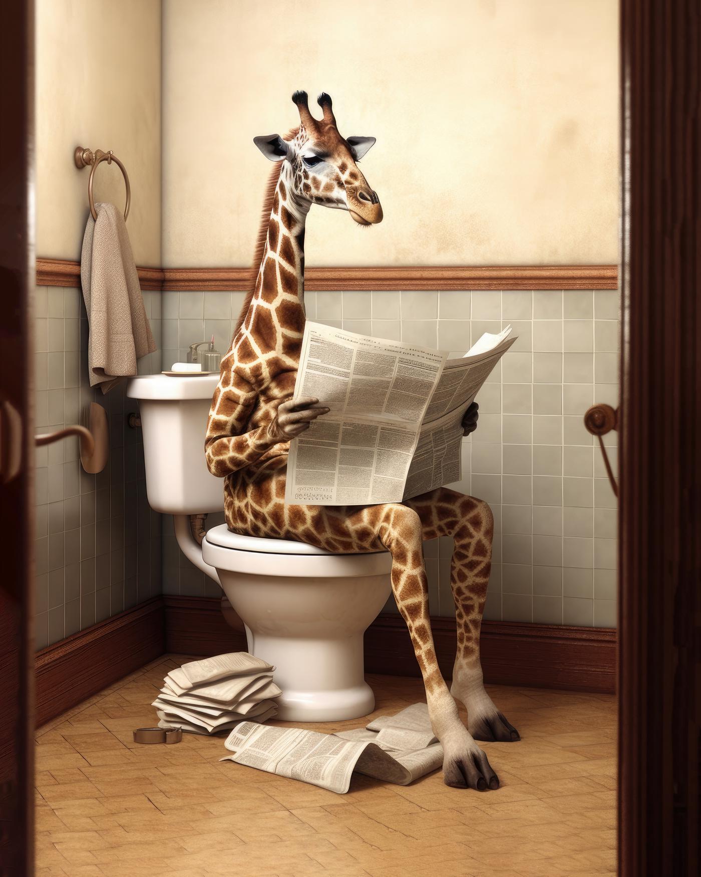 Leinwandbilder - Giraffe mit Zeitungspapier auf der Toilette