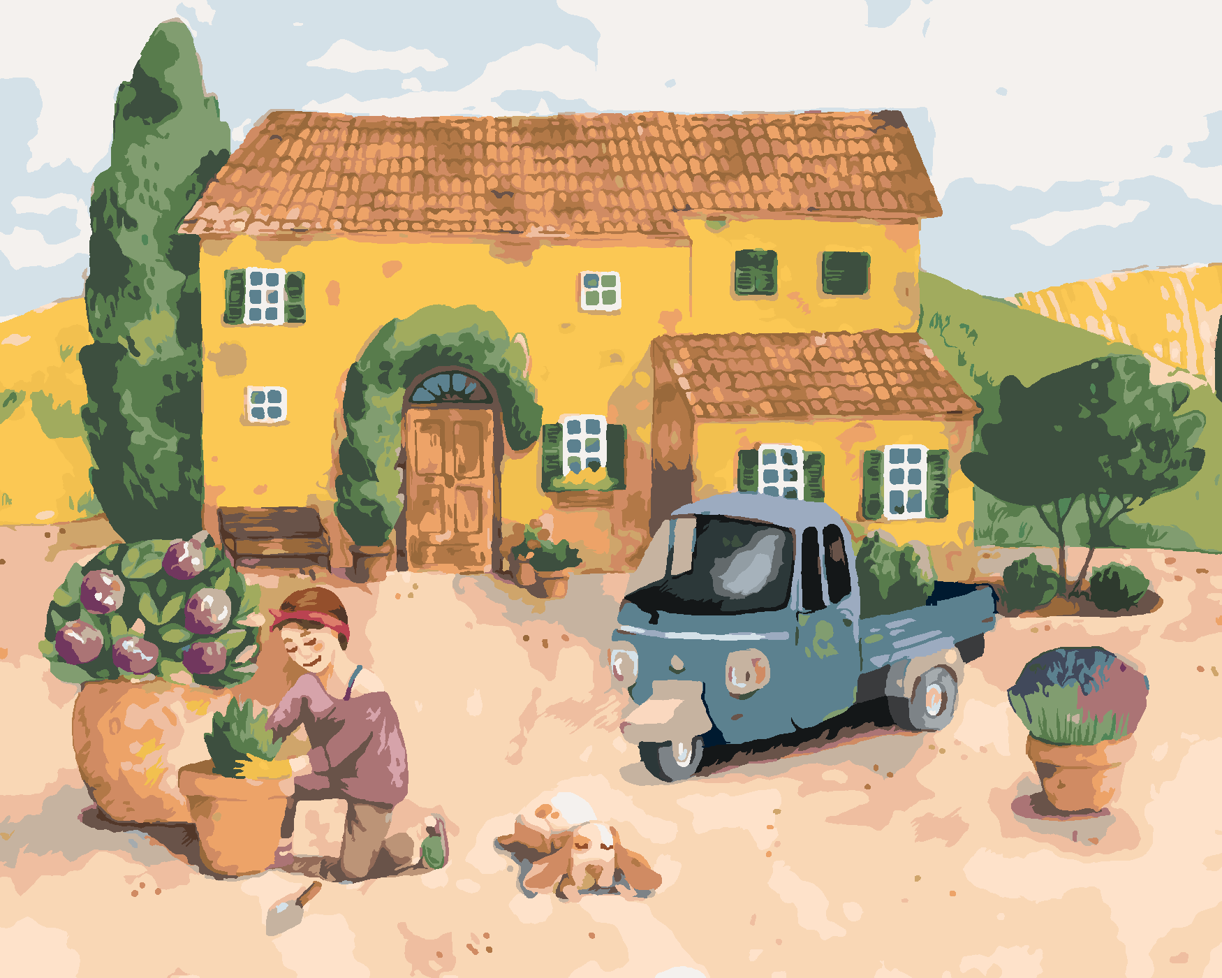 Malen nach Zahlen - FRAU PFLANZT BLUMEN IM HAUS IN DER PROVENCE