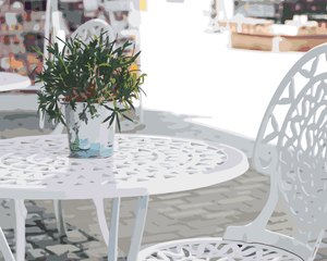 Malen nach Zahlen - BLUMEN AUF WEISSEN MÖBELN IM CAFÉ