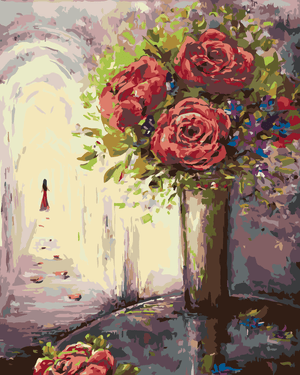 Malen nach Zahlen - ROSEN IN EINER VASE UNDFRAU IN DER...