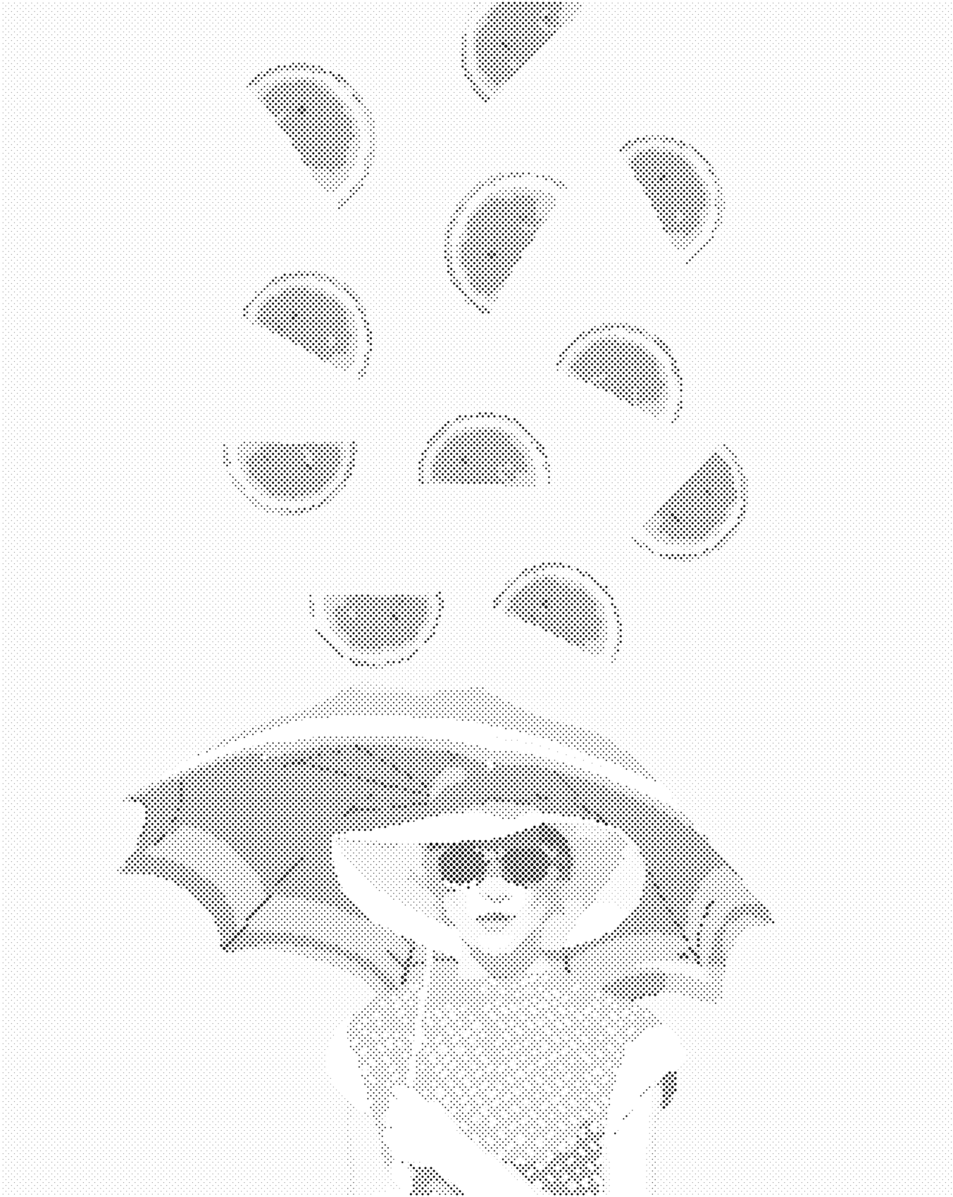 Punktmalerei - FRAU MIT REGENSCHIRM UND FALLENDEN MELONEN