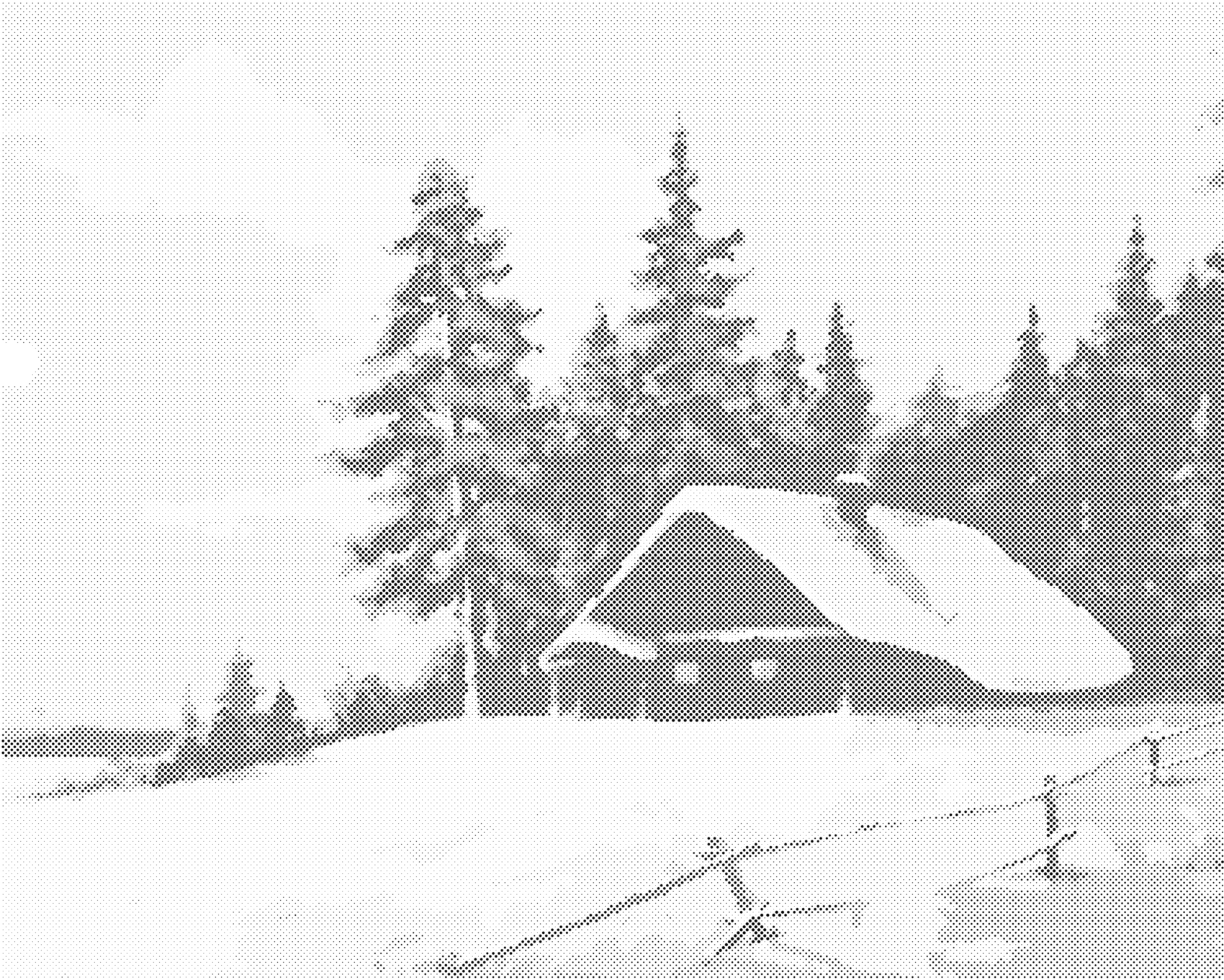 Punktmalerei - BLOCKHAUS IM WINTERWALD UND SONNENUNTERGANG