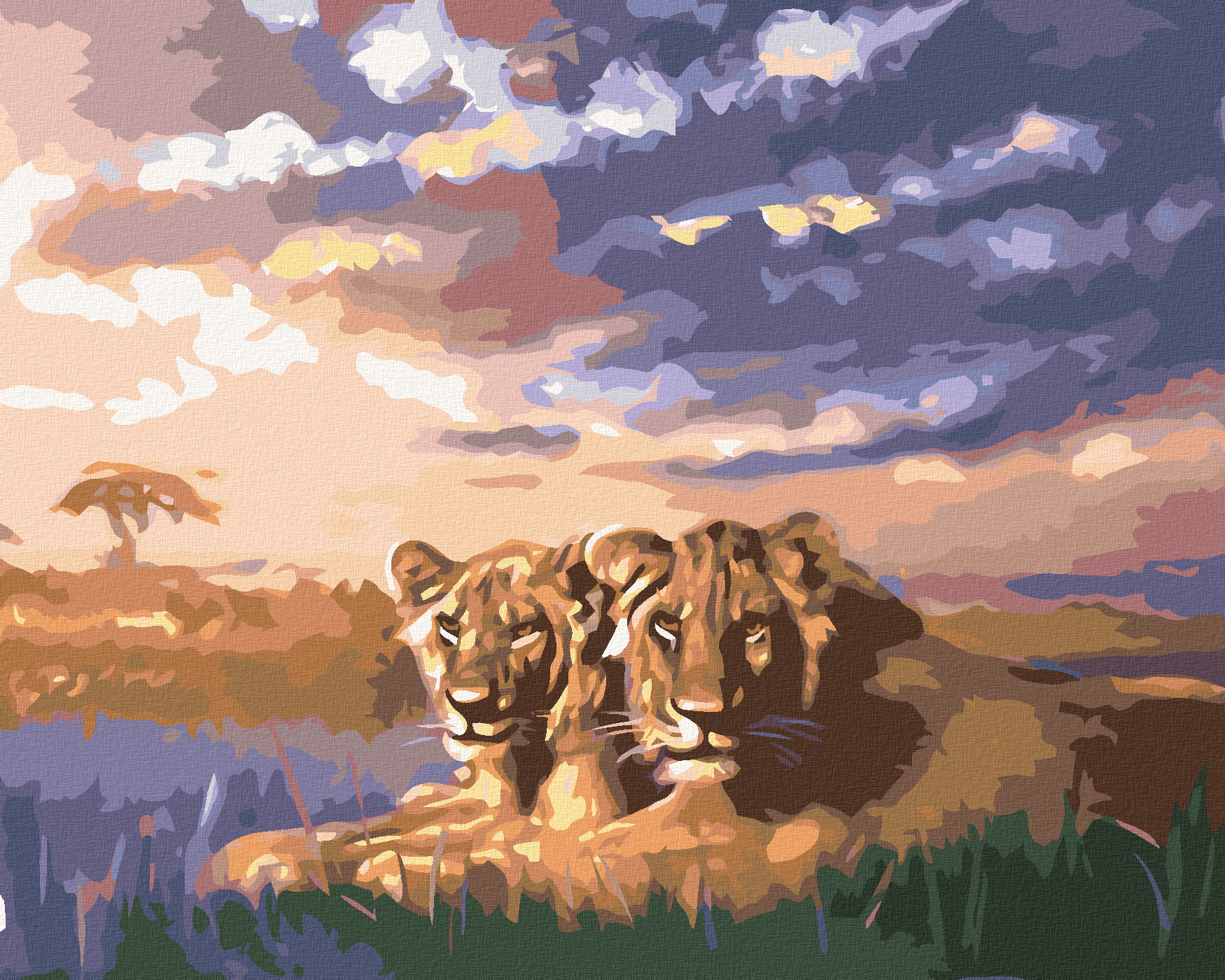 Diamond painting - ZWEI LÖWEN BEI SONNENAUFGANG (D. RUSTY RUST)